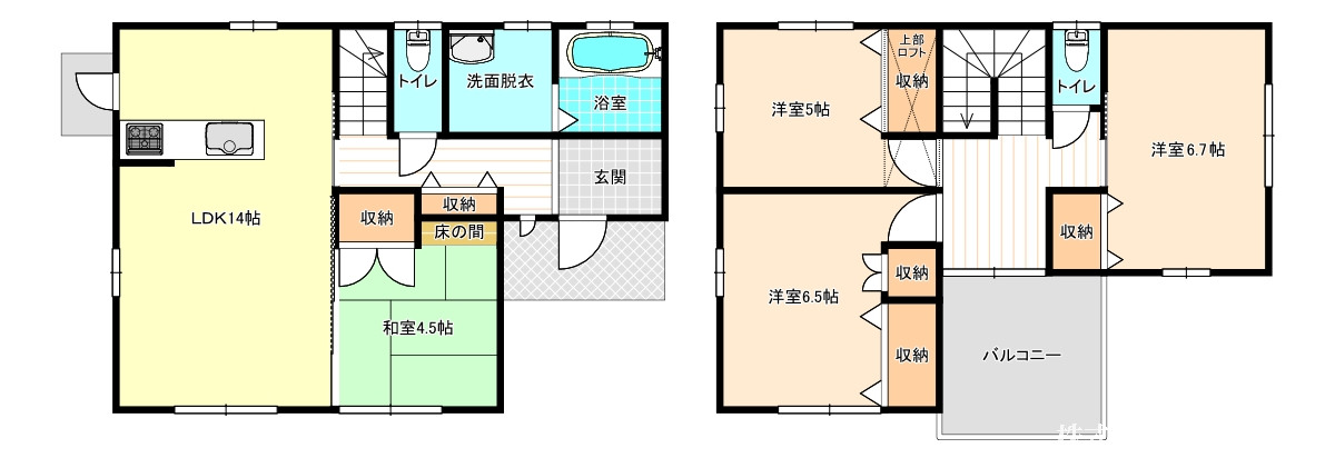 【1階】LDK14、和4.5 【2階】洋6.7、洋6.5、洋5 |